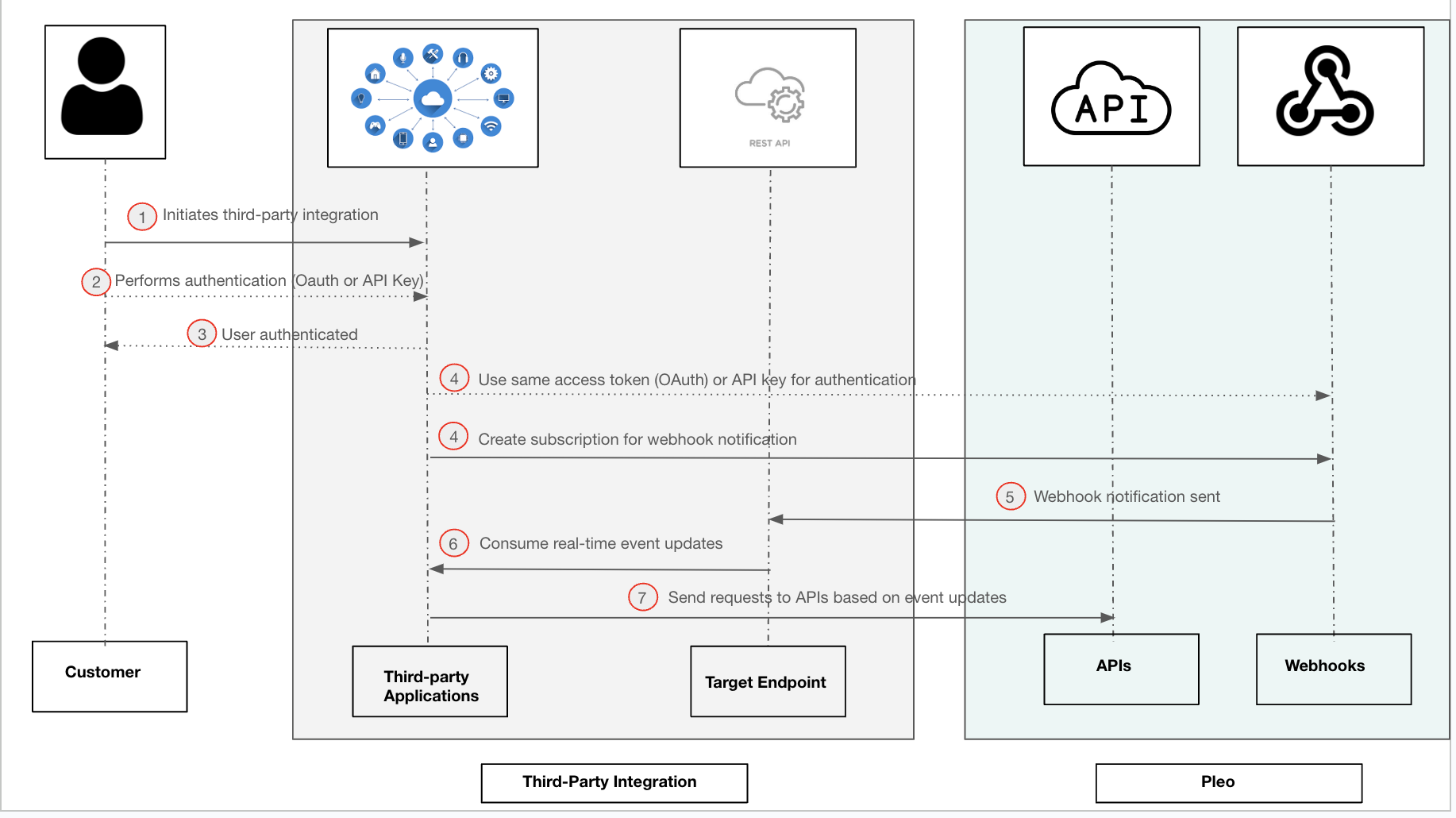 The following diagram explains the workflow among a customer, third-party integration (third-party application + target endpoint), and Pleo (Pleo APIs + Webhook):